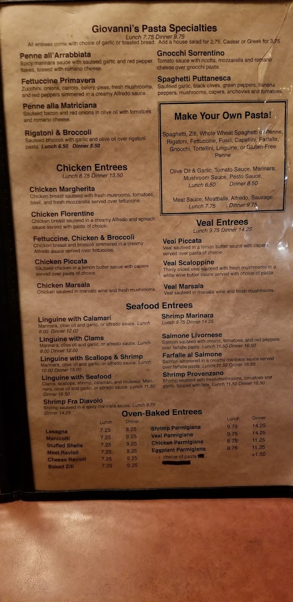 Choices of garlic bread, regular bread, or no bread. Select from a variety of pastas including gluten-free and whole wheat options. Available in dinner or lunch portions. Accompany with sauces like Alfredo, marinara, meatballs, and more.
